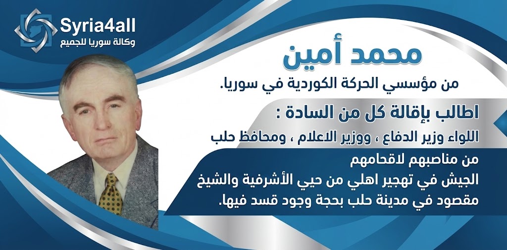 انا المواطن محمد أمين شيخ عبدي المعروف ب(( شيخ أمين )) والمقيم في دمشق ، خريج سجون حافظ الاسد (( 100 شهر عرفي أب 1973_ تشرين الثاتي 1981 )) عضو المكتب السياسي للبارتي حتى آب 2011 , عضو هيئة رياسة اعلان دمشق منذ عام 2007 أتقدم بطلبي ودعوتي هذا الى سيادة رئيس الجمهورية أحمد الشرع :